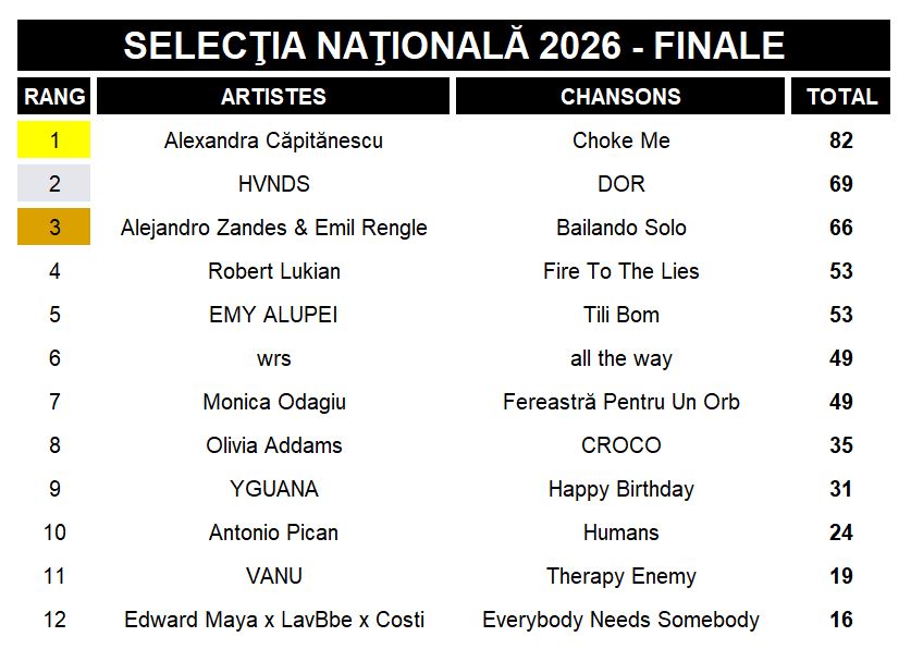 Au terme de la soirée, Alexandra Căpitănescu s’est imposée avec Choke Me, convainquant les jurés par une performance solide et une proposition artistique jugée compétitive pour l’Eurovision.