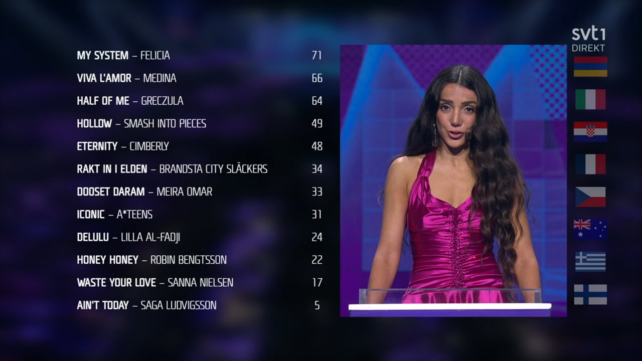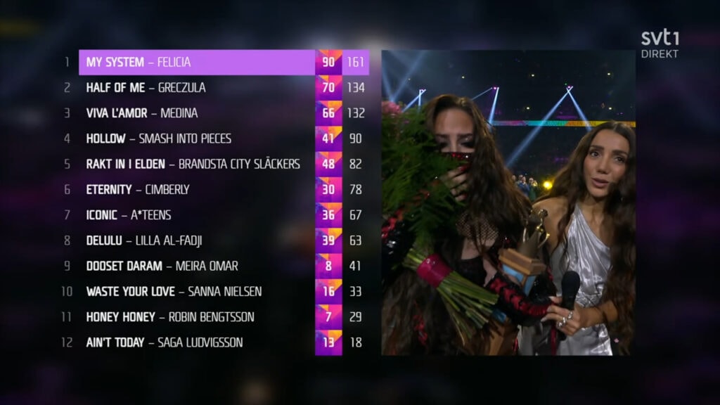 La chanson gagnante, My System, est un morceau pop aux influences électroniques écrit par Felicia Eriksson avec plusieurs auteurs scandinaves. Sorti en février 2026, le titre s’est rapidement classé en tête des charts suédois et est devenu l’un des favoris du public pendant la compétition.